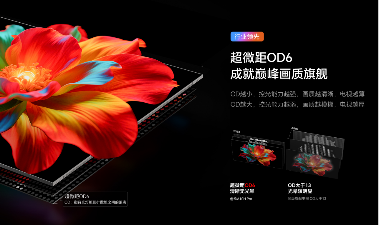 OD是背光灯珠到屏幕之间的混光距离,数值越小,距离就越短,光线也就更加聚焦。创维A10H Pro是行业首款采用超微距OD 6技术的电视,将OD缩短至6mm的极限距离,提升亮度的同时还能有效减少光晕,显示人物或物体时,边缘更加清晰分明。