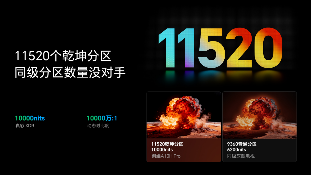 而在背光分区方面,创维A10H Pro的拥有最高11520个乾坤分区,可以精细化调节不同区域的亮度,大幅减少杂散光对显示效果的影响,让黑色不发灰、彩色更鲜艳,明暗细节都清晰可见,有效提升画面对比度和层次感。通过一整套精细的控光技术,创维A10H Pro做到了最高10000尼特的超高峰值亮度。