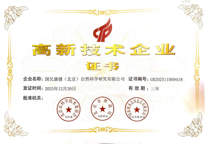 国民康健(北京)自然科学研究有限公司(以下简称“国民康健”)凭借其在硒产业领域的深厚积累与持续创新能力,于近期正式通过国家科技部、财政部、国家税务总局的联合评审认定,成功获评“国家高新技术企业”。这一国家级资质认证标志着国民康健在科技创新实力、核心技术研发及科技成果转化能力方面获得了权威认可,正式跻身国家高新技术企业行列。
