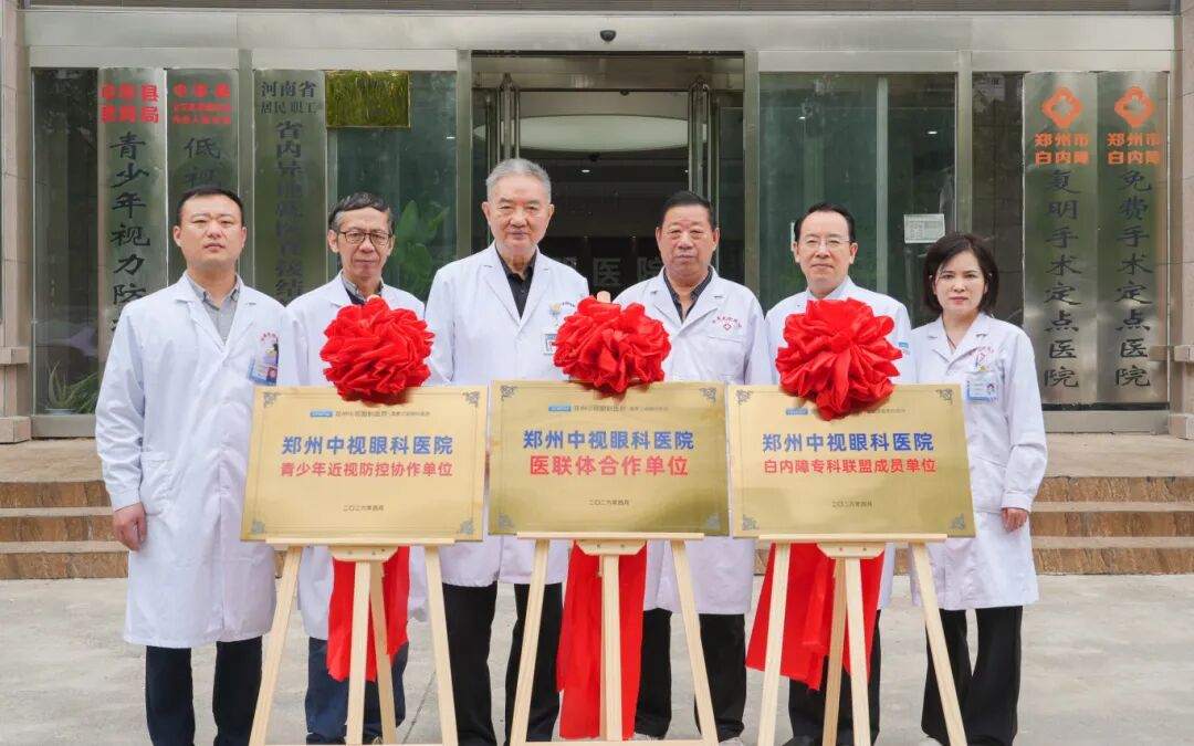 仪式现场,中牟光明医院马书林院长、马建宾院长、孙金凤院长,与郑州中视眼科医院专家团队——国内知名眼科专家张金嵩教授、侯习武教授、刘德成主任等共同出席,见证了这一携手共赢的时刻。双方共同签署医联体合作协议,并先后为“郑州中视眼科医院医联体合作单位”、“白内障专科联盟成员单位”、“青少年近视防控协作单位”揭牌,标志着两家机构正式建立技术共享、人才互通、服务联动的长效协作机制,为后续学科共建与资源下沉奠定坚实基础。