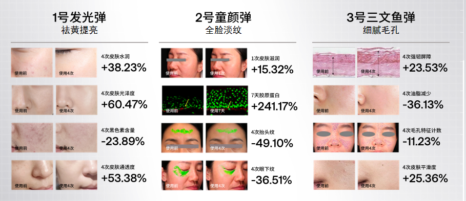 极萌童颜弹采用了薇旖美同源成分重组III型胶原蛋白,有效减少皱纹,让肌肤维持光滑细腻;发光弹采用了英诺小棕瓶同源成分谷胱甘肽,抑制黑色素生成,提亮肤色;三文鱼弹搭载丽驻兰三文鱼同源成分PDRN,改善泛红、修复皮肤屏障。